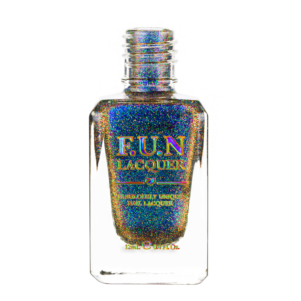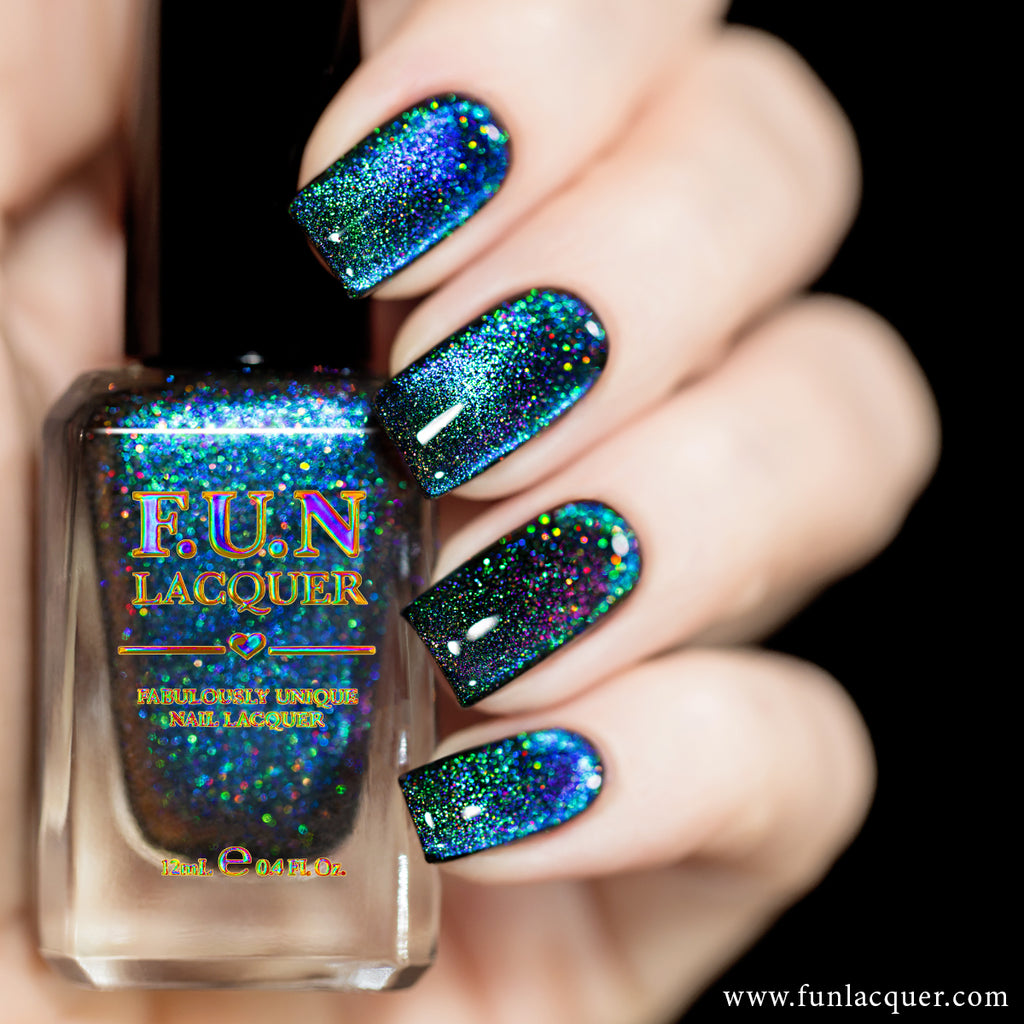 Mistletoe Sky captures the wonder of a winter night illuminated by sparkling holiday lights. This dazzling multichrome magnetic polish shifts between deep sapphire, emerald green, and hints of teal, creating a breathtaking aurora-like glow across the nails. The shifting pigments are enhanced with ultra-reflective holographic particles, giving every movement a burst of prismatic brilliance—like snowflakes glistening under Christmas lights.